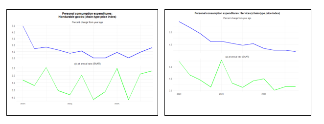 It notes the contrasting behavior of goods and services inflation for consumers and calculates the impact of tariffs on US inflation, drawing implications for the Fed. It draws attention to the pickup in the rate of inflation in some investment deflators and in the price of government spending, the latter related to the shutdown.