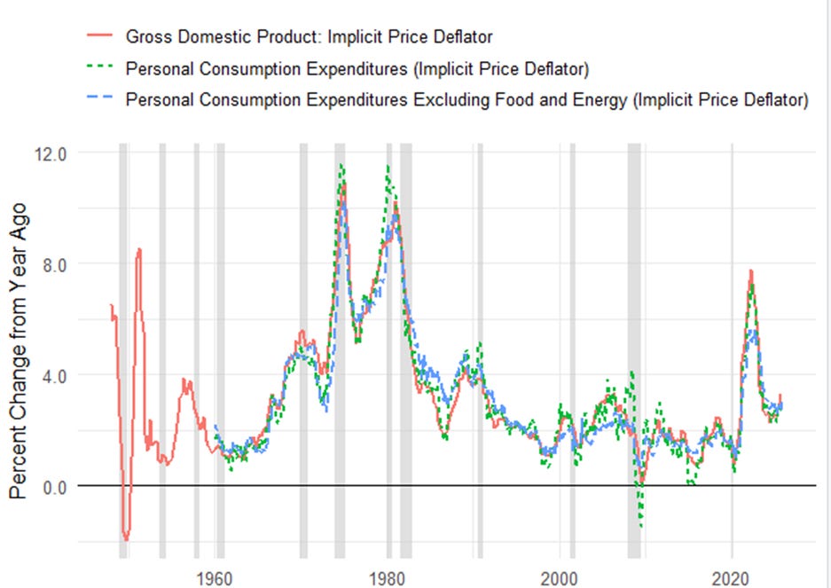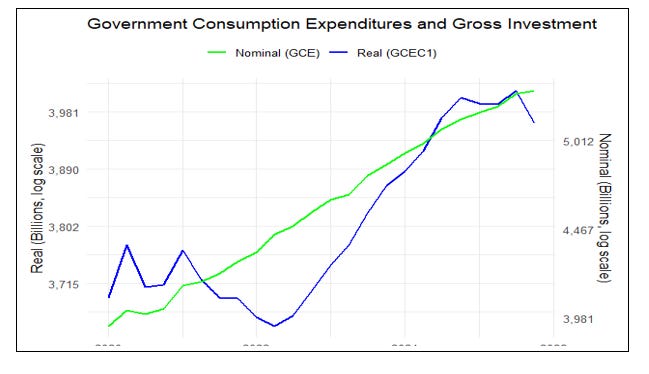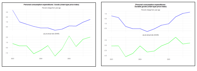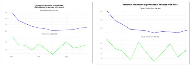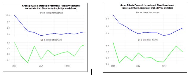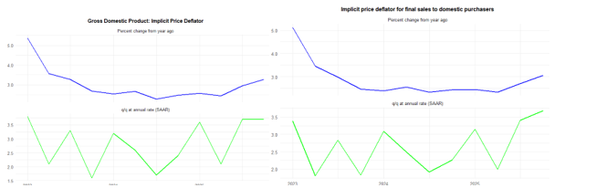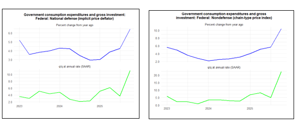 The long-lasting government shutdown distorted these figures. Employees who were not paid for a period still had their wage entitlements recorded on an accruals basis, and later got back-pay. In terms of output, that was measured by the actual hours they worked, so volumes dropped. Accordingly, the price index (nominal spend/real volume of output) was boosted. This faster rate of increase in the government spending deflator contributed to the faster increase in price inflation for GDP and domestic expenditures. The effect should unwind in 2026Q1.